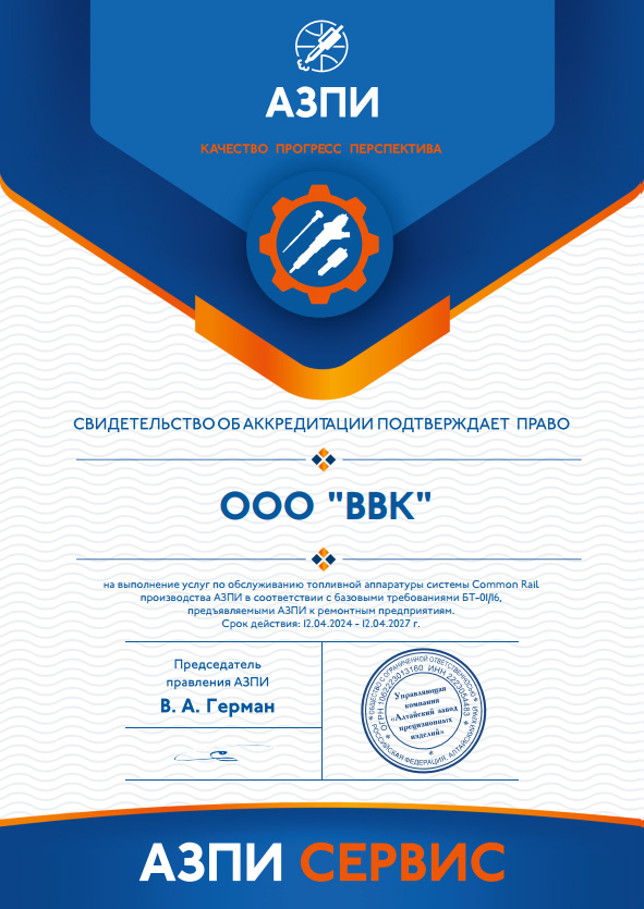 C 2021 года ООО «ВВК» является аккредитованным сервисным центром на выполнение услуг по обслуживанию топливной аппаратуры системы Common Rail производства АЗПИ.